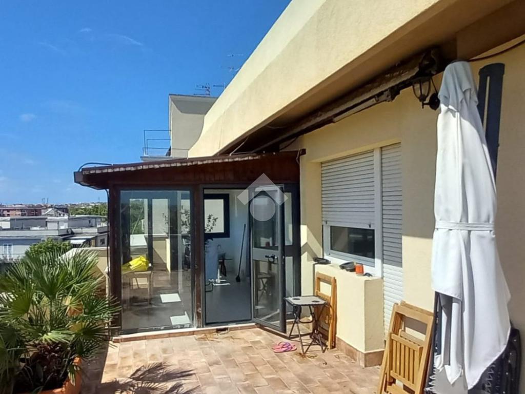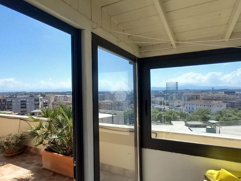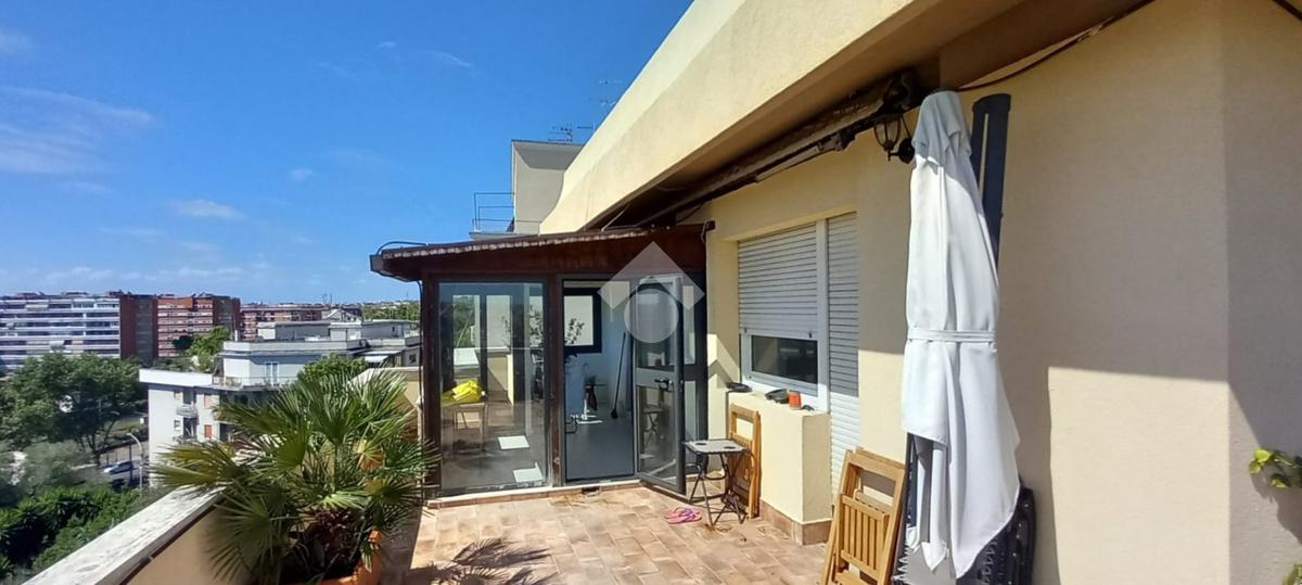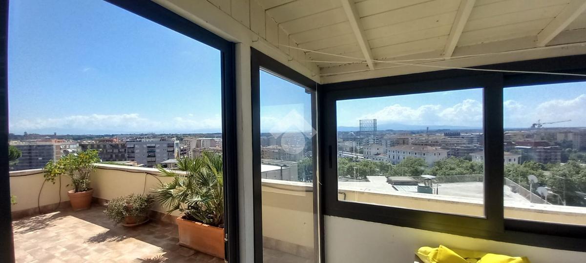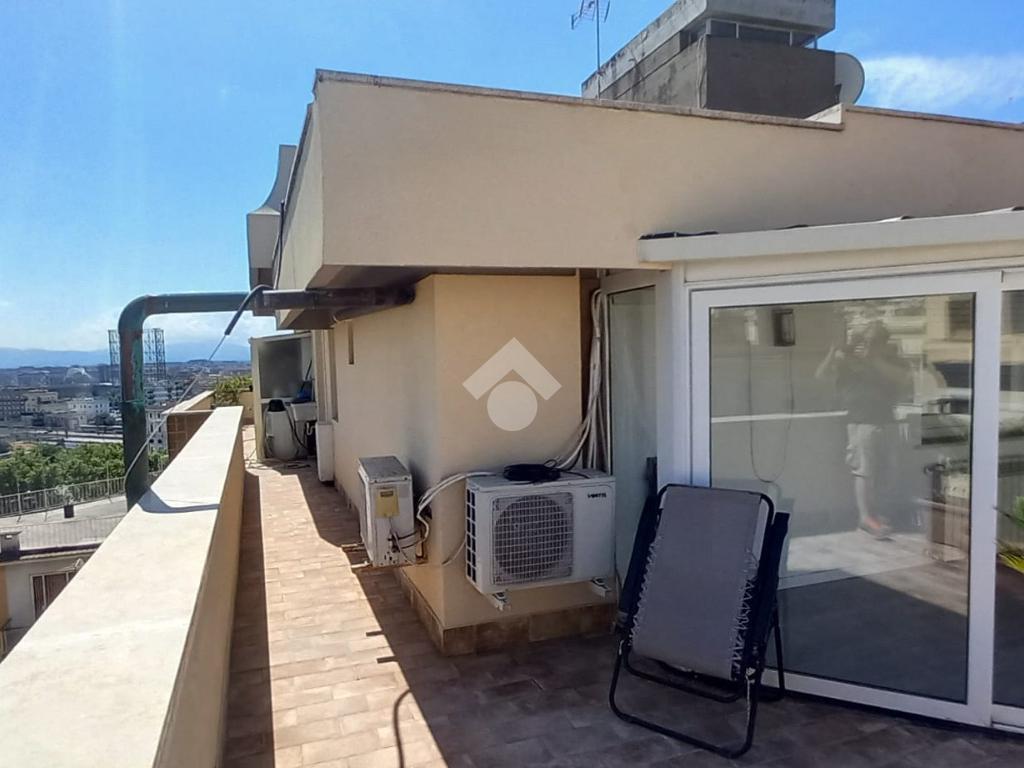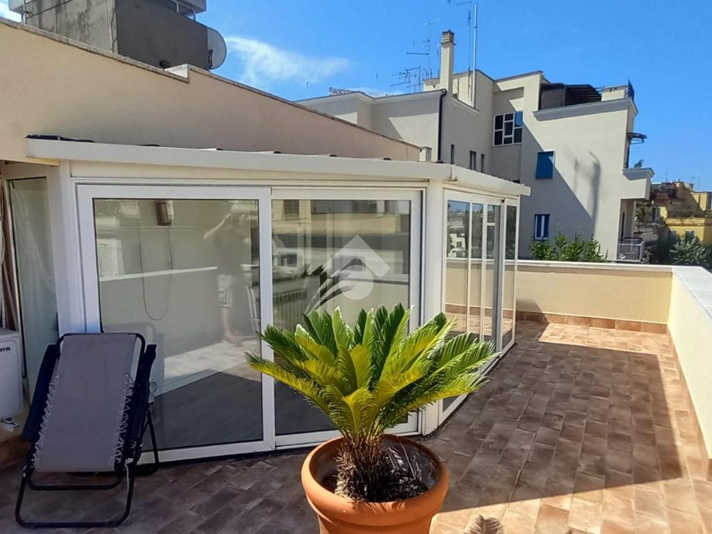 In zona residenziale, proponiamo in affitto un attico situato all'ultimo piano di un edificio costruito nel 1950 composto da ingresso, soggiorno, due camere, cucina abitabile, due bagni ed un terrazzo di 100 mq ca.